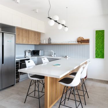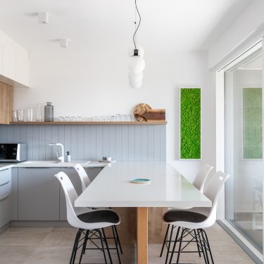 Az élettér fókuszában a nappali-konyha-étkező egy nagy térben található, ami tágas és barátságos atmoszférát teremt. Az ablakokon áradó napfény az egész teret megtölti, miközben az innen elérhető teraszról kilátás nyílik a Balatonra. A nappaliban és étkezőben a fa anyag, fehér és szürke felületek elegáns és harmonikus kombinációját alkalmaztuk, amelyeket a kék színű kiegészítések és részletek fokoznak. A terasz egy ideális hely a kikapcsolódásra és a szabadban való étkezésekre.