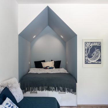 A nyaralóban elhelyezett beépített bútorokat is egyedi terveink alapján készítették, figyelembe véve a kényelmet és a praktikumot egyaránt. A lakásban két hálószoba található, amelyek egyszerre kényelmesek és stílusosak. A beépített szekrények és ágyak a rendelkezésre álló teret optimálisan kihasználva kínálnak megfelelő tárolási lehetőségeket.