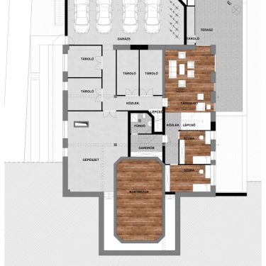 A háromszintes épületnek az alagsori részén a kiszolgáló funkciók (garázs, tárolók és gépészet) kaptak helyet, illetve az egyik két szintesre tervezett lakás innen kapott kertkapcsolatot.