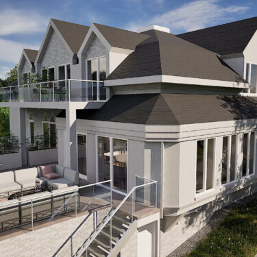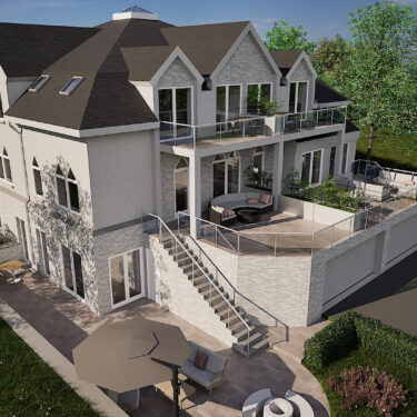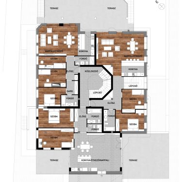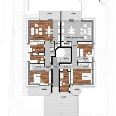A földszinten 3 lakóegység különül el egymástól, amiből kettő gyönyörű panorámával rendelkezik, a hátsó rész pedig 2 nagy terasszal kertkapcsolatot kapott.