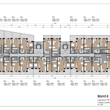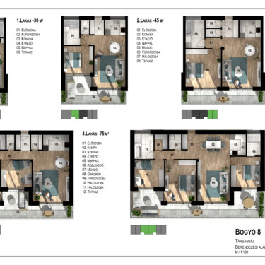 A tervezés során kiemelten fontos volt a variálható lakáselosztás, így egy 30 m2-es és egy 45 m2-es lakóegységet terveztünk. Ezeket egymás után sorolva igény szerint összevonhatjuk, ezzel  60, 75, 90, 105 vagy akár 120 m2-es lakóegységet alakíthatunk ki. A parkolószám meghatározásánál a lehető legtöbb elhelyezhető lakóegységgel számoltunk.