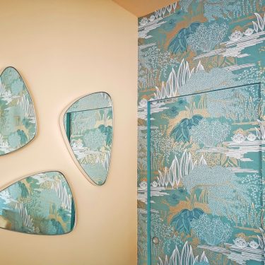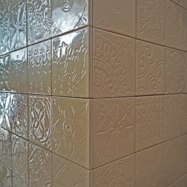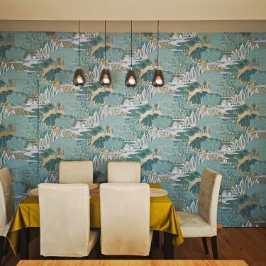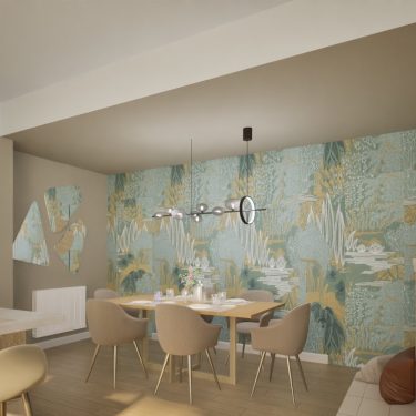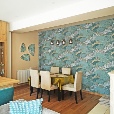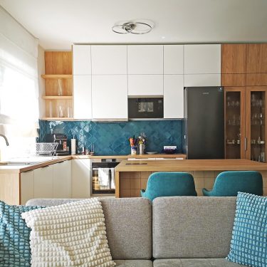A megrendelők a világos színeket kedvelik, ezért fehér, bézs, szürke árnyalatokat használtunk, de bekerültek színesebb kiegészítők, amik a tapétákban vagy a konyhában a pult felet lévő egyedi kerámiaburkolatban jelent meg. Ezeket a színvilágokat végig vittük a többi helyiségben is. Így ezek maghatározó részei lettek a háznak.
