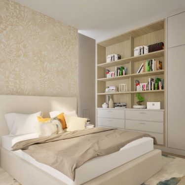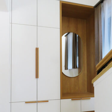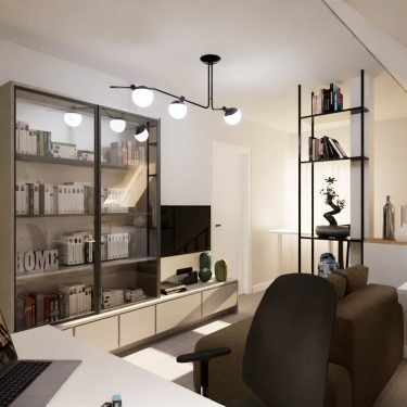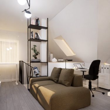 Az emeleti részen, ami kihívás volt az a közösségi rész, ahol több funkciót kellett kialakítani. Két darab munkaállomást több tárolóval, és egy pihenő részt. Eközben figyelnünk kellett, hogy a közlekedés zavartalanul történjen a szobák között. Több egyedi bútor készült, mert voltak a háznak adottságai, amit csak így tudunk megoldani, ami még több tárolási lehetőséget biztosított, aminek nagyon örültek.