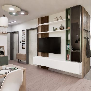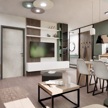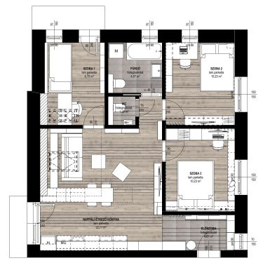 A 62 m2-es lakás központi része az amerikai típusú konyha-étkező és nappali, amibe egy igazán praktikus, de mégis látványos előtéren keresztül jutunk.