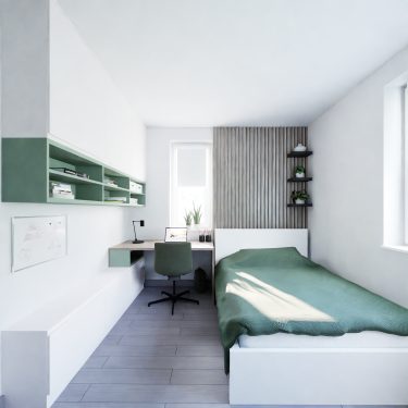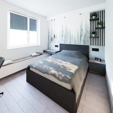A szobák is követik a lakás stílusát, de specifikusan a fiúk igényei szerint lettek kialakítva, mint pl. a nagy íróasztal, vagy a szabadon álló ágy.