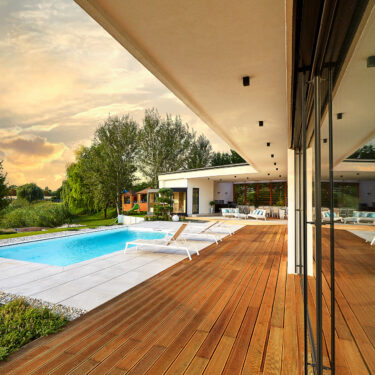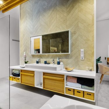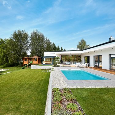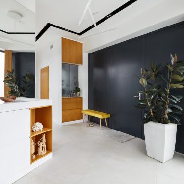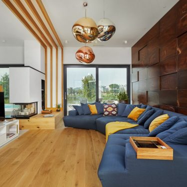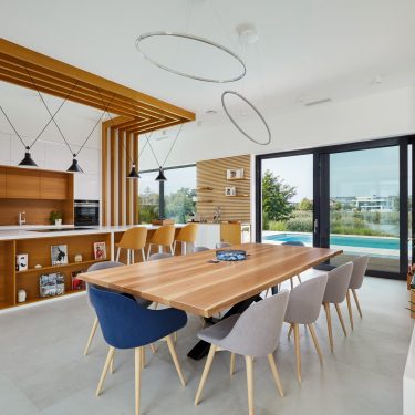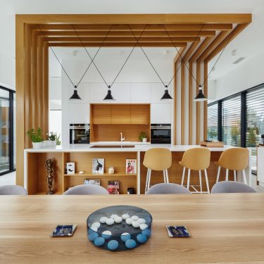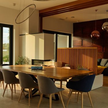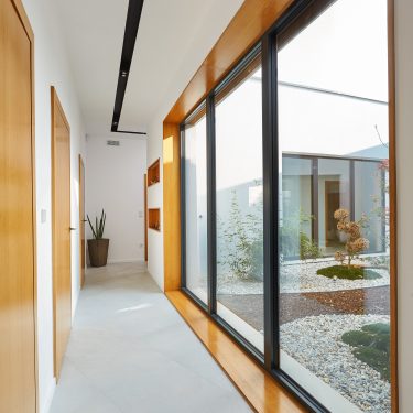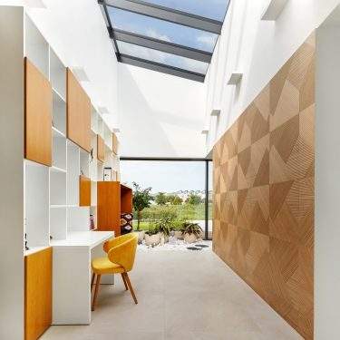 Meghatározó volt a belsőépítészet tervezésekor a ház tópartra néző tájolása, a belső átrium és a terek funkcionálisan elkülönített elrendezése. A házba való megérkezéskor egy impozáns előtér és abból nyíló dolgozószoba fogadja a vendéget, egyből feltárul a tóparti panoráma és a hatalmas felülvilágítónak köszönhetően fényben úszik a tér.