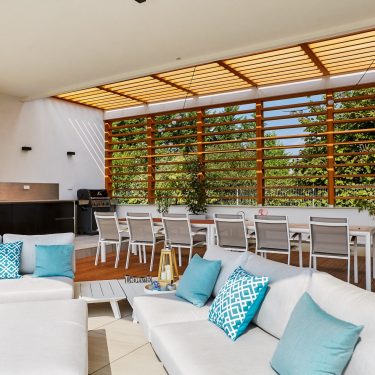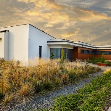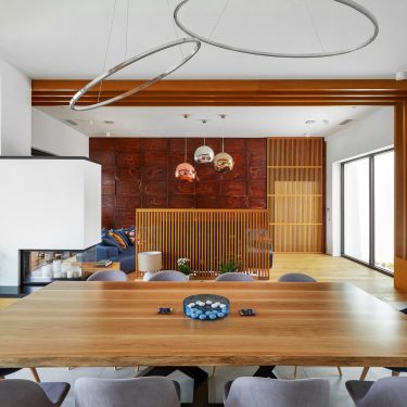 A dolgozószobát is magába foglaló magasabb tömegben a közösségi terek és fő hálószobák kaptak helyet. Az itt lakó család aktív életet él és sok időt tölt a szabadban, így a fedett-nyitott terasz is kiemelt figyelmet kapott. A nappali-konyha-étkező a belső átriumnak köszönhetően két oldalról is végig ablakokat kapott. A ház belső terei teljesen átláthatóak, nem elválasztja, inkább összefogja a kis belső udvar a két tömböt. A közösségi terek kialakításakor egy olyan téregyüttes létrehozása volt a cél, amiben látszik hol különülnek el a funkciók, de mégis egy egységként működik az egész, ehhez az egyik eszköz a konyhát körbe szegő és a nappalit leválasztó fa gerendákból kialakított keretezés. A nappaliban hangsúlyos elem a corten acél hátfal, mely anyaga ridegsége ellenére, színének köszönhetően melegséget hoz a térbe.