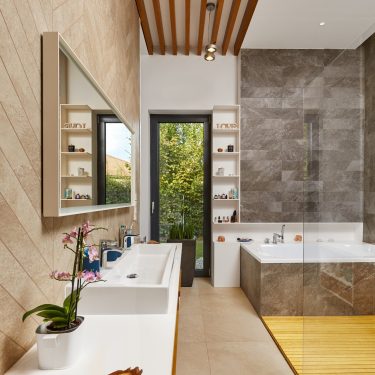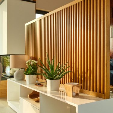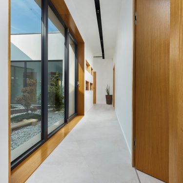 A belső terek stílusának illeszkednie kellett a ház modern külsőjéhez és anyaghasználatához, miközben otthonosságot és melegséget sugároz magából. A fő belsőépítészeti elemekhez időtálló anyagok lettek választva, a tölgyfa felületek – szürke/bézs kő – fehér színkombináció lehetőséget adott arra, hogy az alap berendezések merészebb színű kárpitos bútorokkal és kiegészítőkkel legyenek párosítva. A természetes anyagok melyek a ház egészében megjelennek összefogják a belső designt, de eszközt is adnak arra, hogy finoman szétválasszák a funkciókat.