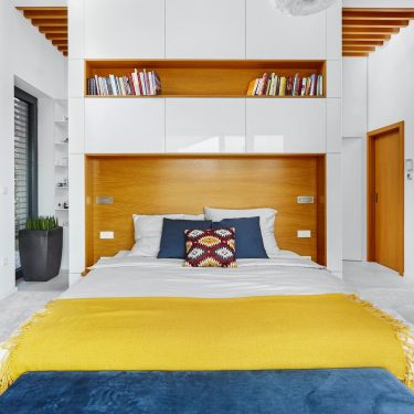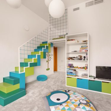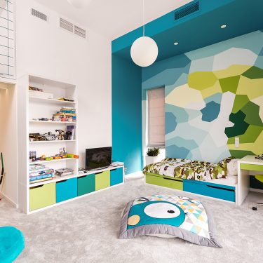 A hálószobák a játék és mese birodalmai a gyerekek számára, egyedi falfestések készültek melyek feldobják a tereket. A szülőknek a pihenés és feltöltődés helye a hálószoba és a hozzá kapcsolódó nyitott fürdőszoba. A belső átriumot körbe ölelő folyosóról nyílnak a további hálószobák és a kiszolgáló helyiségek, itt törekedtünk a funkcionalitásra és a ház többi részével való harmonizálásra.
