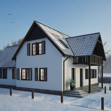A tervezés fontos része az anyagok pontos meghatározása, mely egyedi arcot kölcsönöz a háznak. Esetünkben törekedtünk az egyszerűségre; fehér falakkal, sötét fa ablakokkal, a tető natúr színű fedésével és a lábazat kő burkolatával szerettünk volna egyensúlyt találni a költséghatékonyság, szépség, időállóság és minőség tekintetében.