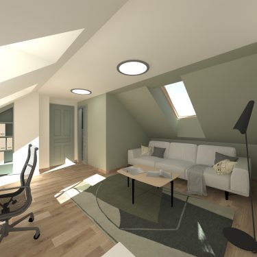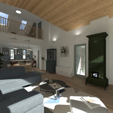 Az ügyfelek kifejezetten azt szerették volna, hogy a felújítás során megőrizzük az épület eredeti karakterét és hangulatát, mind belül, mind kívül. Ezért olyan tervezési megoldásokat alkalmaztunk, melyek lehetővé tették a régi és az új harmonikus egyesítését. Például a meglévő sötétzöld mázas cserépkályhát megtartottuk, mint a helyiség egyik fő különlegességét, ami hozzájárul az otthonos és meleg hangulathoz.