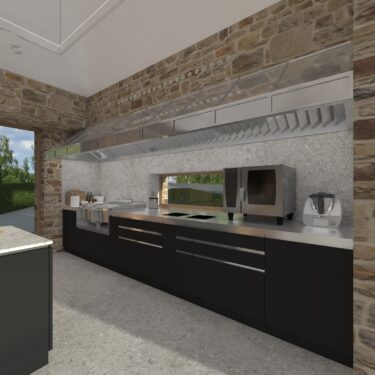 A nagyobb épület földszintjén helyezkedik el a tágas nappali, konyha és étkező, melynek dupla belmagassága és a felülvilágítókkal megvilágított koporsófödémje elegáns és impozáns légkört teremt. A nappali kertre néző oldalának üvegfelületei szinte egybefonódnak a terasszal, így harmonikus kapcsolatot teremtve a beltér és a kültér között. A professzionális konyha kialakítása különös figyelmet kapott, hogy a megrendelő könnyedén fogadhassa vendégeit és élvezhesse a főzés örömét. Ezen a szinten továbbá található egy hálószoba és fürdőszoba is, biztosítva a kényelmet és privát teret a család számára.
