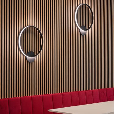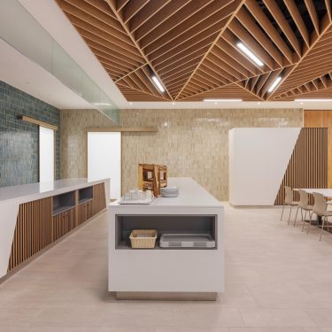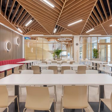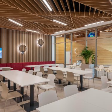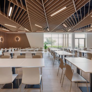 A közösségi terek kialakításánál kiemelt figyelmet fordítottunk az étterem területére. Itt nem csak a szépség elvárás, hanem a praktikum is: a mobíliáknak amellet, hogy könnyen tisztíthatónak és időtállónak kell lennie illeszkednie kell a környező terekhez is. Az építészeti elgondolás szerint az épület természetközeli kialakítás kiemelkedő szempont, ezért hatalmas ablakokkal láttuk el a tereket.