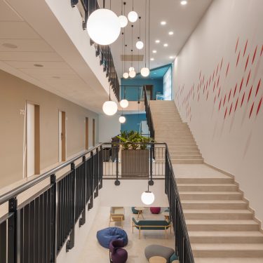 A külső és belső világ összekapcsolása alapvető tervezési szempont volt, ezért a színvilágban is erre reflektáltunk. Az épület meghatározó belső világ fehér, sötétszürke színek, valamint fém szerkezetek, fa- és kőhatású burkolatok köré szerveződött. A néhány helyen megjelenő erősebb színek izgalmas dinamikát kölcsönöznek az enteriőrnek. Például az egy-egy falfelületen tájékozódást segítő jelzések is kontrasztos színek használatával kerültek kijelölésre.