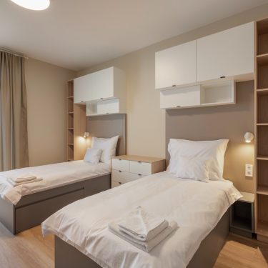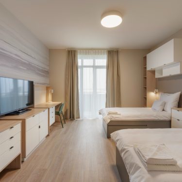 A szállás épületek tervezésénél figyelembe kellett vennünk későbbi funkcióikat is. Egy részükben állandó lakhatásra szolgáló lakrészeket, az akadémián tanuló diákok kollégiumi szállását és közösségi területeit kellett kialakítani. Más részüket rövidebb időre, szállodaként fogják használni.