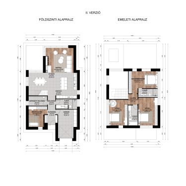 A másik alaprajz nem sokban tér az előbb bemutatottól. A földszinti fürdő és kamra helyére egy nagyobb méretű fürdőszoba került és a konyha kiegészült egy szekrénysorral. Az emeleti gyerekszobák megnövekedett területe miatt a főháló konszolidáltabb méretet kapott. A különböző alaprajzokhoz természetes másfajta nyílászáró kiosztás is tartozik, amely érzékelteti mennyi lehetőséget hordoz magában az épület.